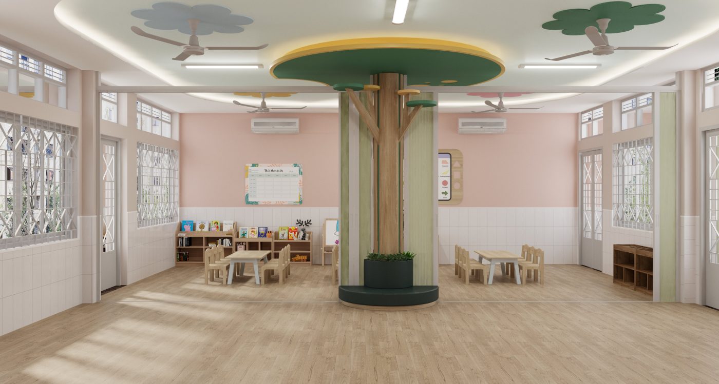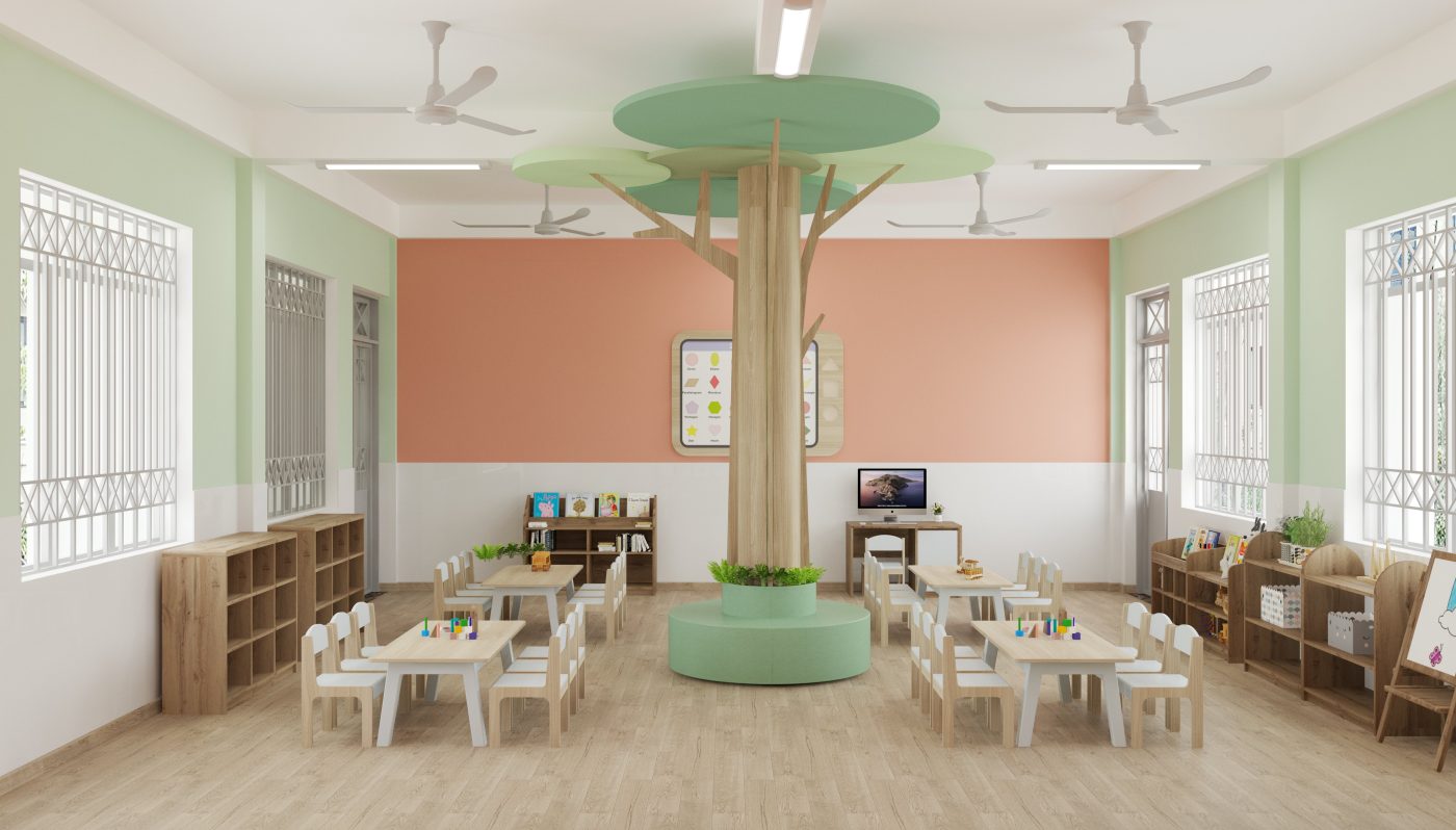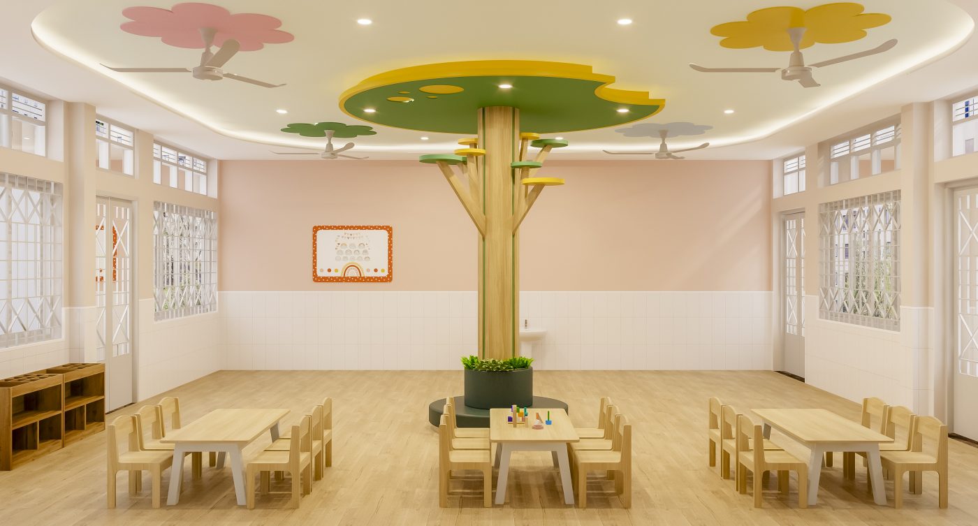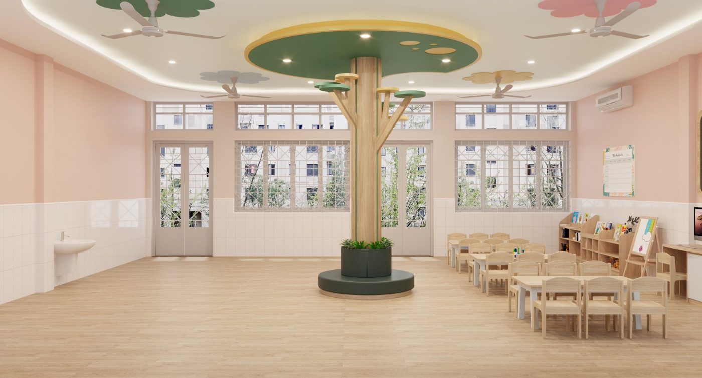 Phòng học được thiết kế trang nhã, sử dụng màu sắc trung tính, mang chủ đích tối giản, để các con có nhiều không gian sáng tạo và tưởng tượng, cũng như nuôi dưỡng gu thẩm mỹ và trí tuệ cảm xúc phong phú.